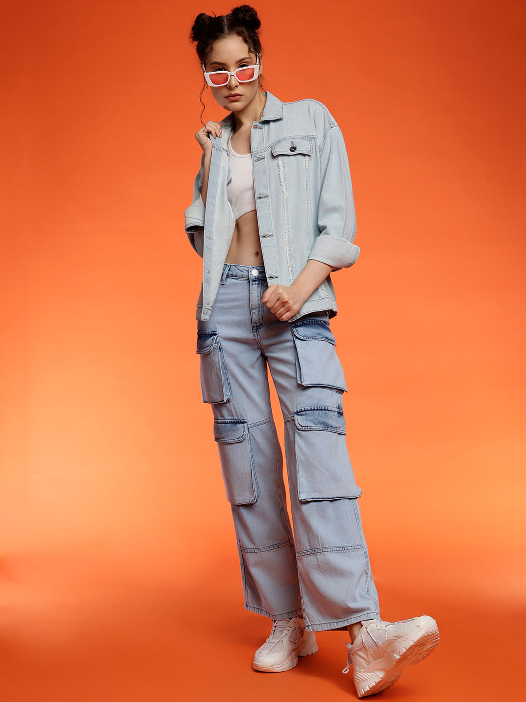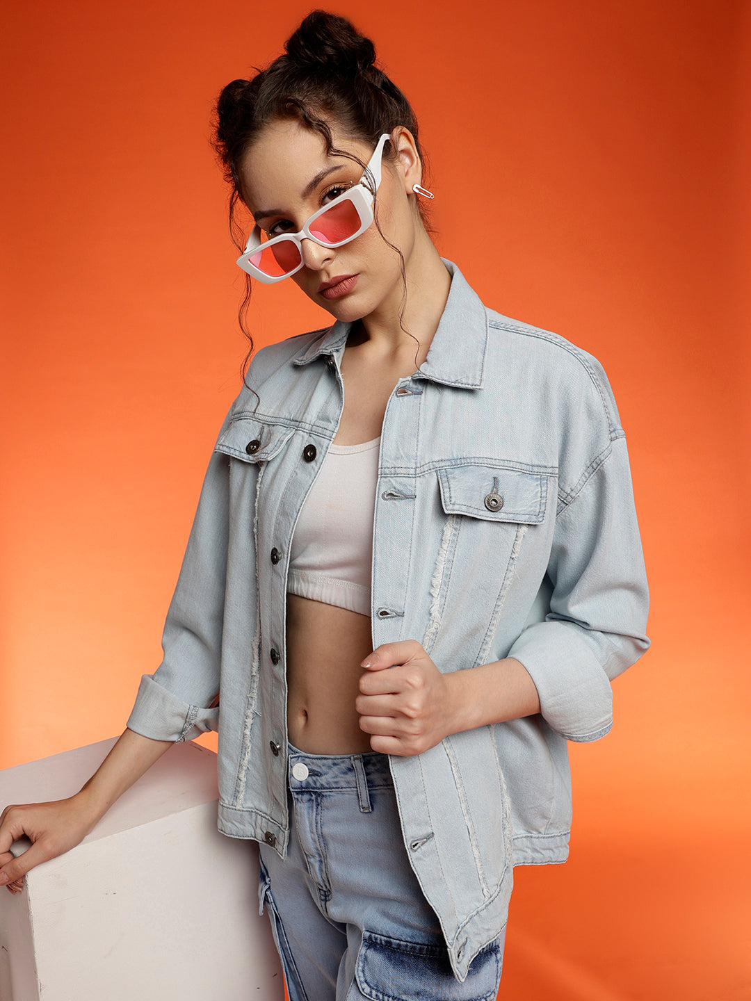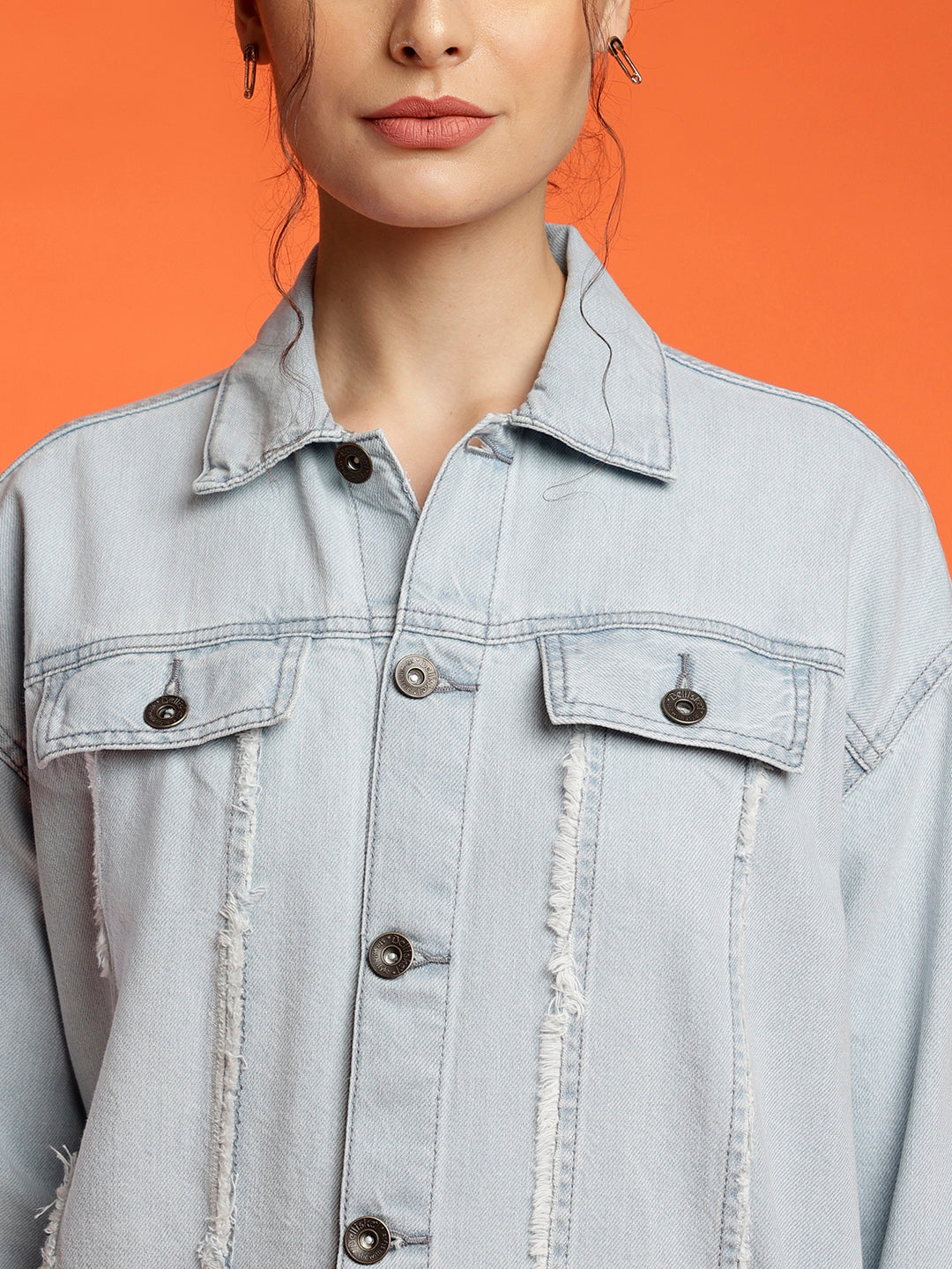 Get this comfy and stylish Light-Blue jacket from the latest collection of Belliskey. It features a spread collar, full-sleeves and has a button placket on the front. It comes with two pockets on the front making it a functional design. Adorned with a solid pattern, it makes up for a beguiling choice. Crafted with rich denim, it assures you the best of comfort at all times. Perfect for weekend wear or casual wear. Match it with a short black dress and sneakers and you are all set to go.